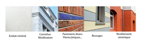 - Placage d'élèments rapportés: Pierres naturelles, briquettes, revêtement ceramique, etc...